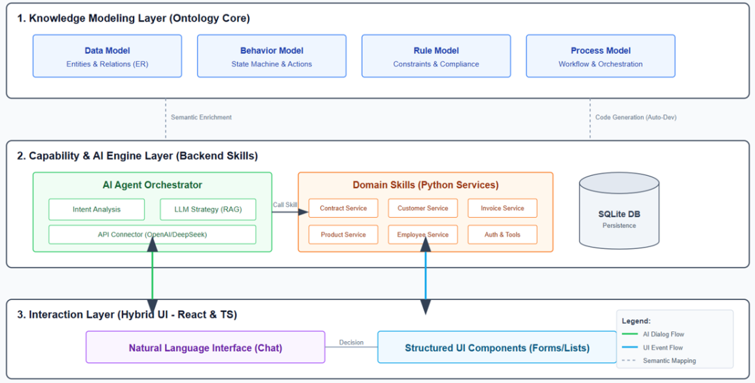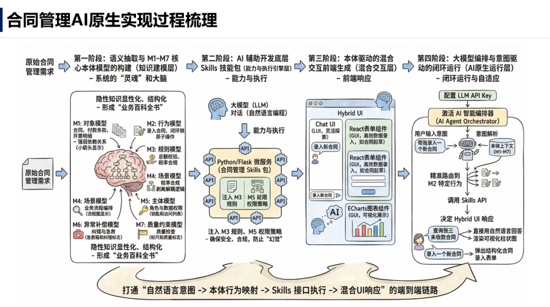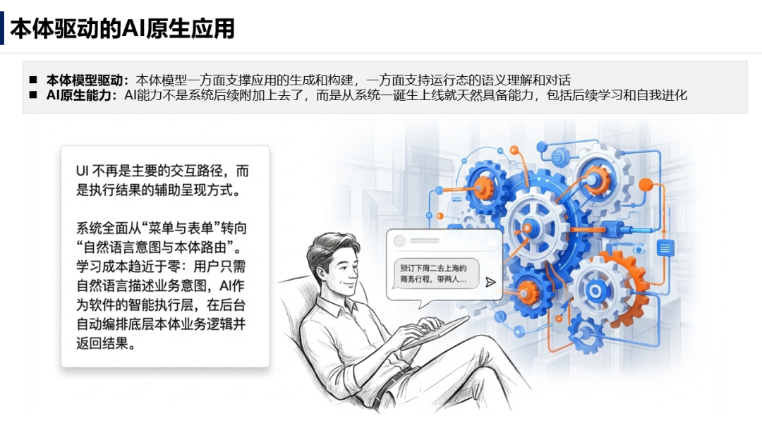 第一个本体建模。在这个过程中,跟 AI 有多轮的对话迭代。最后完成一个精确的本体模型的语义定义。第二个就是借助 AI 大模型,它要去开发底层的本体模型的能力层的skill 的技能包。第三步实现本体驱动的混合交付式前端UI。第四部分最终的运行态,基于用户的意图,自然对话式的运行。