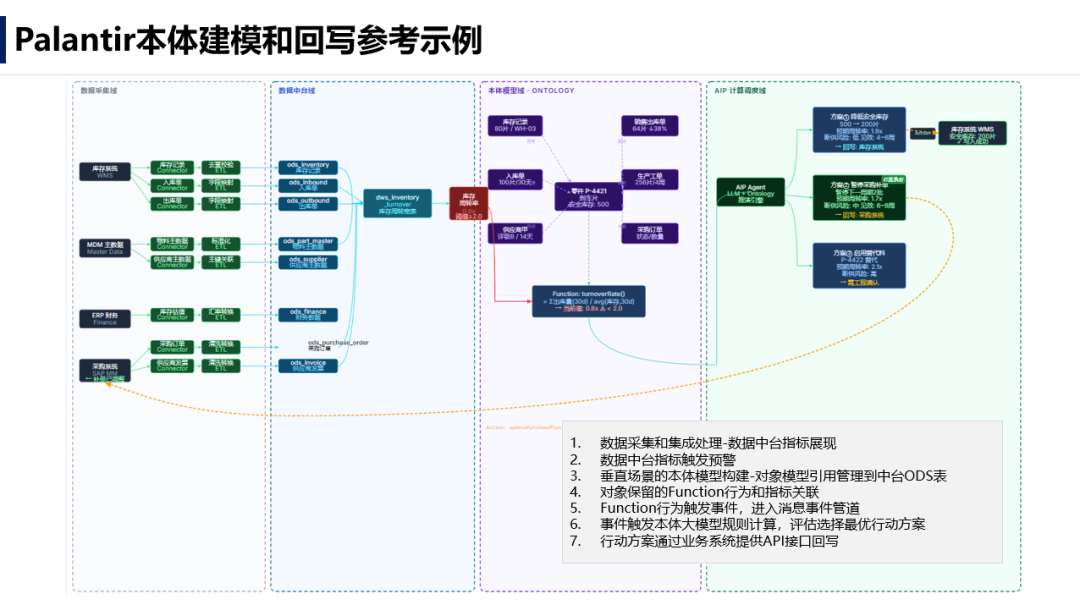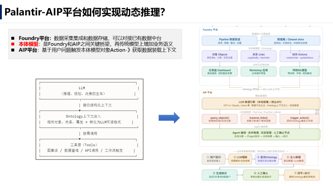 然后再通过回写接口回写回业务系统,这样形成一个完整的闭环,包括我在前面也专门有文章谈到了AIP平台,它是整个如何去完成实现一个动态推理的过程。本体模型就是构建了 Foundry 和AIP之间的一个关键的桥梁,在传统的数据模型上面增加了业务语义。