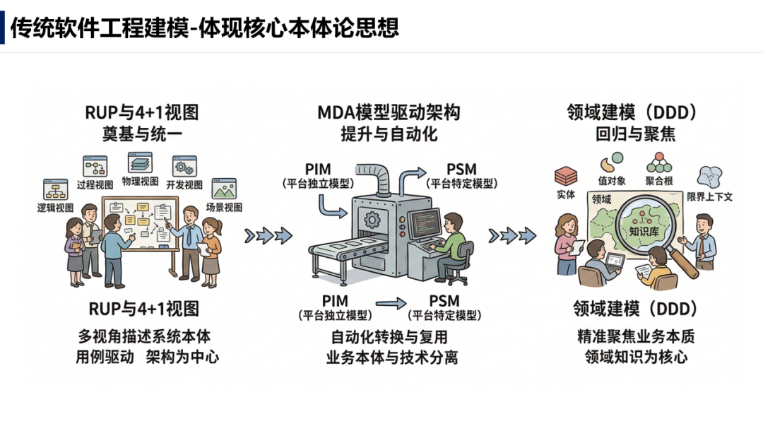 再回到整个软件工程的建模。它其实分了相当多的阶段。从最早期的RUP 的4+1软件架构视图,当时面向对象的分析建模和UML设计相当的火,然后再到我们的MDA模型驱动架构,包括提出了PIM平台独立模型和PSM 平台特定模型。其实 MDA 模型驱动架构就是在软件开发领域最早的本体,然后到再到最近七八年小10年推出的云原生微服务领域建模,去找到核心的领域对象识别领域对象的能力。所有的这一些面向对象分析设计里面,它其实都蕴含了体现了本体论的思想。