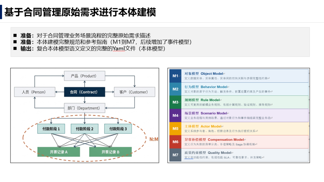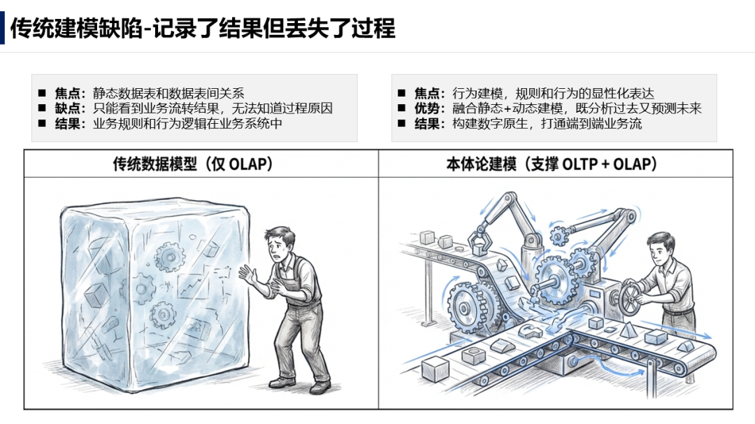 我其实也讲过了,就是传统的建模,它只是记录了结果而丢失了过程语义。他缺少关键的行为建模规则建模。所以说现在核心的本体论的建模,其实就是在传统的数据模型的基础上去补充这一些行为过程规则事件的建模补充原来丢失的业务语义,实现静态和动态两个层次的建模并进行融合,这样才能够真正的一个构建数字原生的应用。