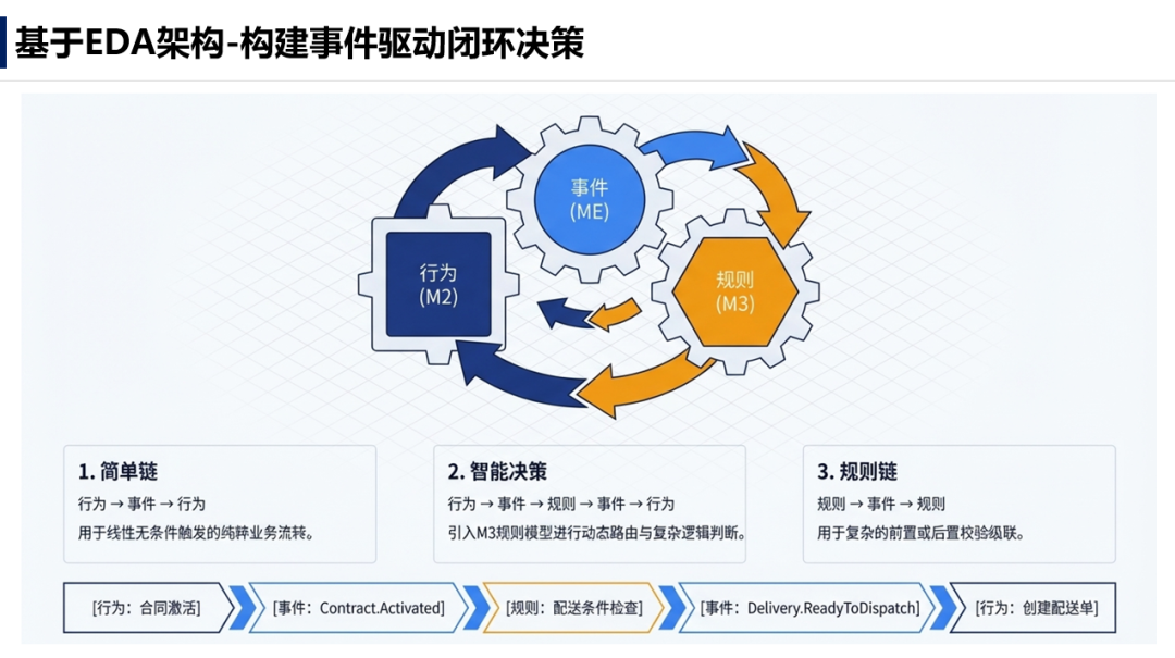 第三个它是基于EDA事件驱动的架构。通过事件的定义,包括行为规则和事件关系和依赖的性定义,形成了完整的事件链,方便实现后续事件驱动场景下的推理触发或改进建议的回写操作。