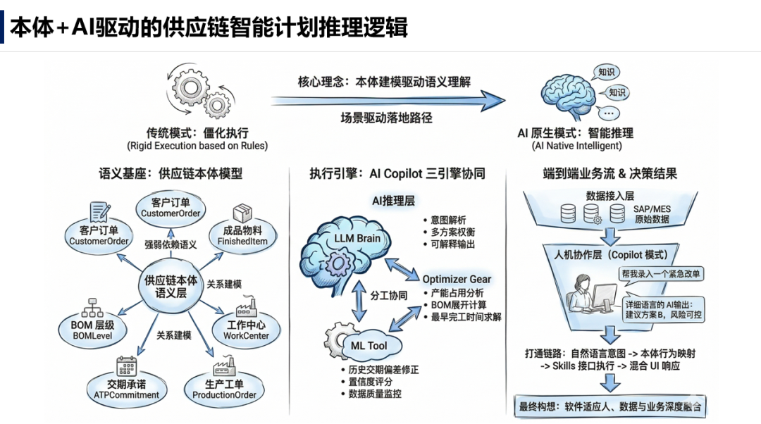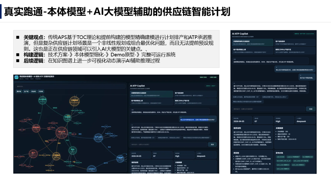 这个系统还有一个例子,就是我在前面跑通的,就叫基于本体模型加 AI 大模型辅助的供应链智能计划。这里面有个关键的观点就是传统的 APS,它是基于 TOC 约束理论的精确建模。但是复杂的供应链场景,它往往是一个非线性规划和组合最优化的问题,无法提前预设规则,也是在供应链领域可以引入本体和 AI 大模型的关键点。