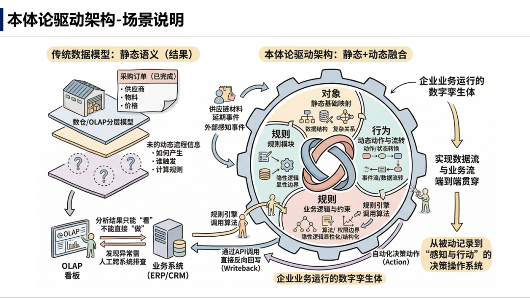 大家可以看得到,本体论驱动的架构里面有一个相当关键的东西,就是我们讲的这个核心的场景,它是一个静态模型和动态模型的融合。它在传统数据模型的基础上补充的行为补充的规则,补充的事件,形成一个完完整整的融合的模型。