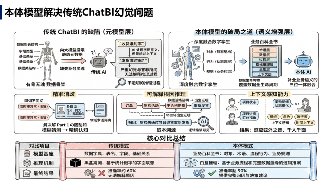 包括前面我有专门文章,也谈到了怎么样通过本体模型来解决ChatBI智能问数的幻觉问题。大家要清楚传统的ChatBI或Text2SQL更多都是基于底层静态的数据模型,只有数据对象和数据之间的关心,缺少了数据形成过程的业务语义,缺少了数据变化相互影响的业务语义。