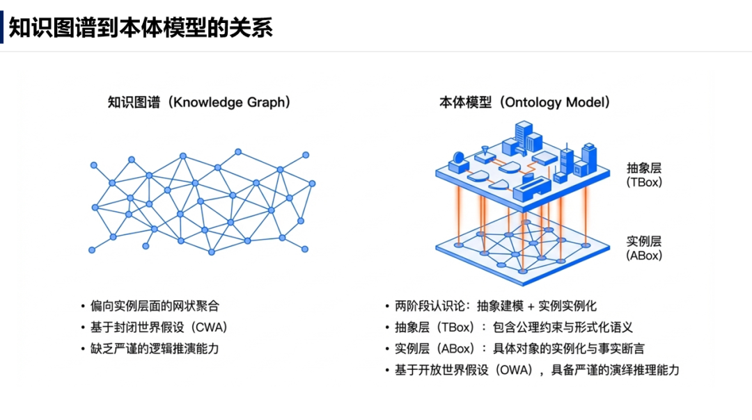 再来看从知识图谱到本体模型。我在前面也讲过了,对于传统知识图谱,虽然说知识图谱里面也有Schema的概念,但是原来我们去构建传统知识图谱的时候,往往是弱化了Schema这一层。而现在的本体建模,大家一定要理解成它是两层语义。