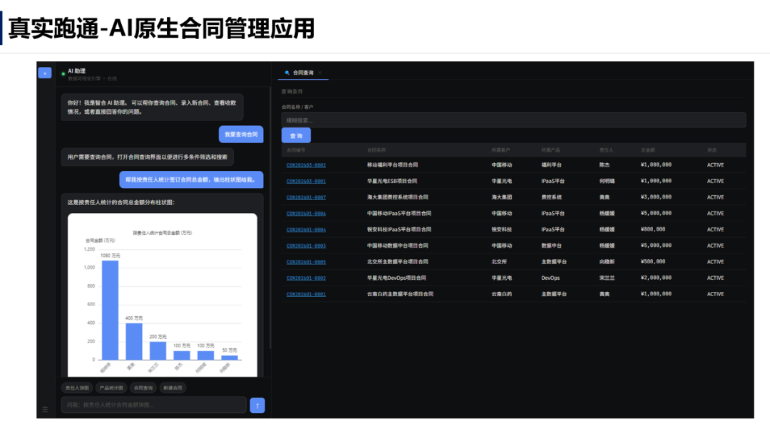 基于这个例子,我基于我的本体模型,我就完整让 AI 通过Codex+GPT5.4 静默编程差不多2~3个小时输出了一个完整的 AI 原生合同管理应用。就是一个简单的 AI 原生合同管理应用的界面,在这个界面左边就是一个 AI 大模型的对话框,右边可能是我提前预设的一些复杂交互的界面。在这个时候,它就可以实现自然语义的业务操作,包括自然语义的查询,整个合同管理的整个实现的过程。