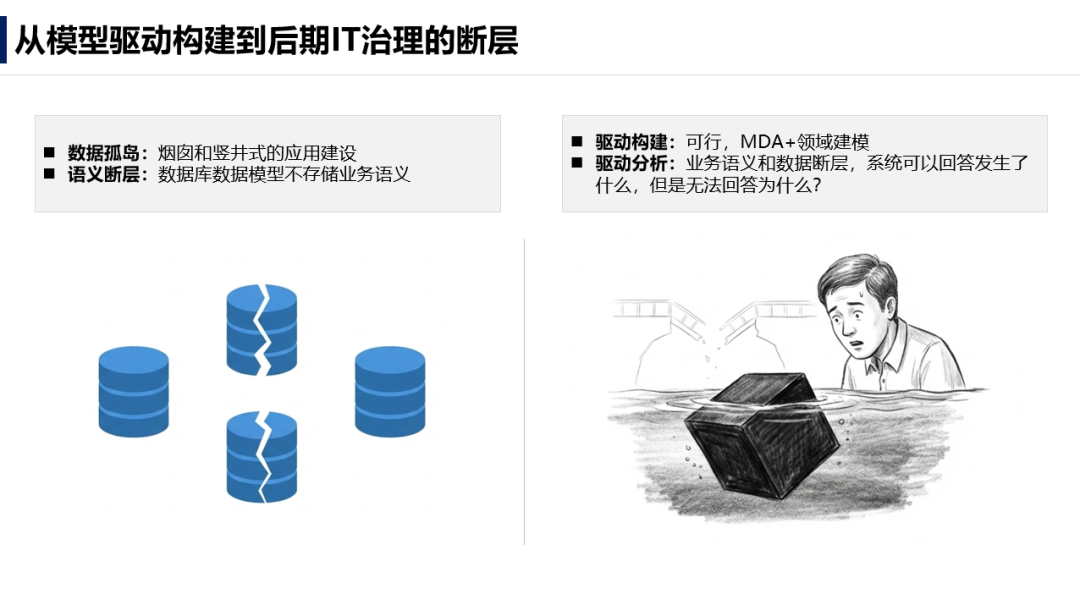 在模型驱动构建完了以后,到后期的 IT 治理,其实出现了断层。断层包括两个方面,第一个就是数据孤岛,比如我们常说的烟囱竖井式的应用。第二个就在语义断层的核心的原因就是数据库落落地的数据模型。它本身只有数据对象之间的关系,它缺少了数据形成的业务语义。
