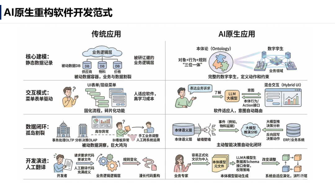 我们再比较一下 AI 原生下面整个软件开发范式会发生一个相当大的变化。不管是在核心建模方式还是交付方式还是数据闭环,还是整个的开发演进都发生了相当大的变化。在这个地方我就不详细再展开了。