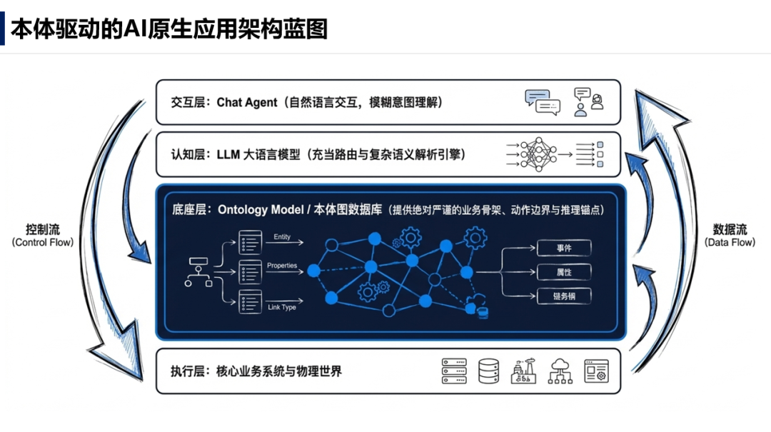 所以基于这个东西,我们又做了一个本体驱动的 AI 原生应用的架构蓝图,包括有交付层认知层底座层,执行层包括底座层里面就含了相关的本体模型。语义的解释包括形成一个完整的 AI 原生的应用的架构设计,最上层就是我们的本体模型层中间是我们的能力层,以大模型为核心,以主域的 Skills 技能包为核心的能力。