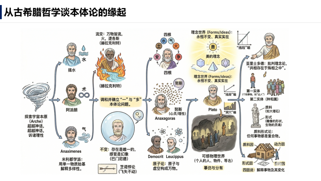 这些早期哲学家,更偏向于宇宙论而非本体论。他们研究的是世界的构成材料,而非"存在"本身的意义。但正是这些朴素的追问,铺就了通向本体论的第一块基石。