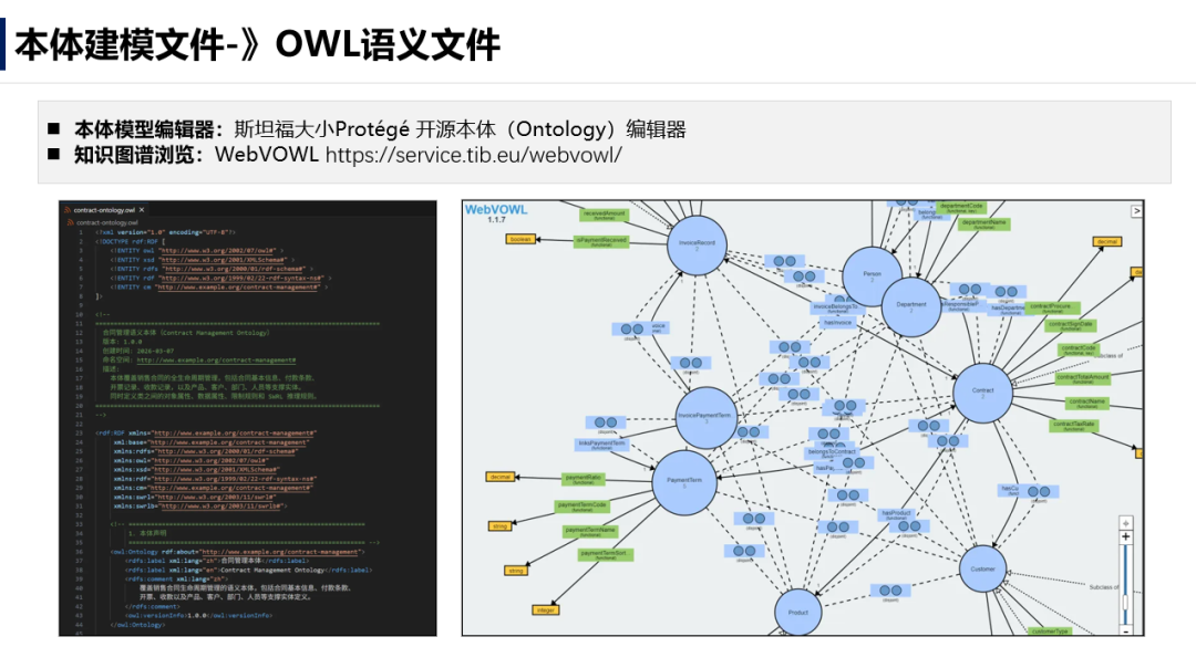 有了这个本体模型以后,我又做了一个小验证,整个本体模型,它还可以转成标准的OWL的语义标准的文件,然后可以把它导到类似于斯坦福的本体模型编辑器,类似于在线的知识图谱浏览。