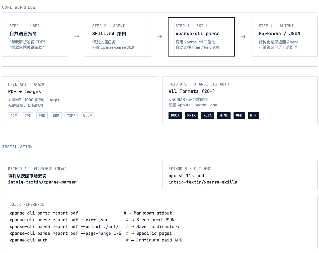 用户说一句话 → Agent 自动识别是文档任务 → 触发 xparse-parse Skill → 调用 xparse-cli → 根据有无凭证自动走免费/付费 API → 返回 Markdown 或 JSON。