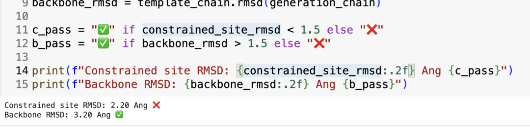print(f"Backbone RMSD: {backbone_rmsd:.2f} Ang {b_pass}")输出: