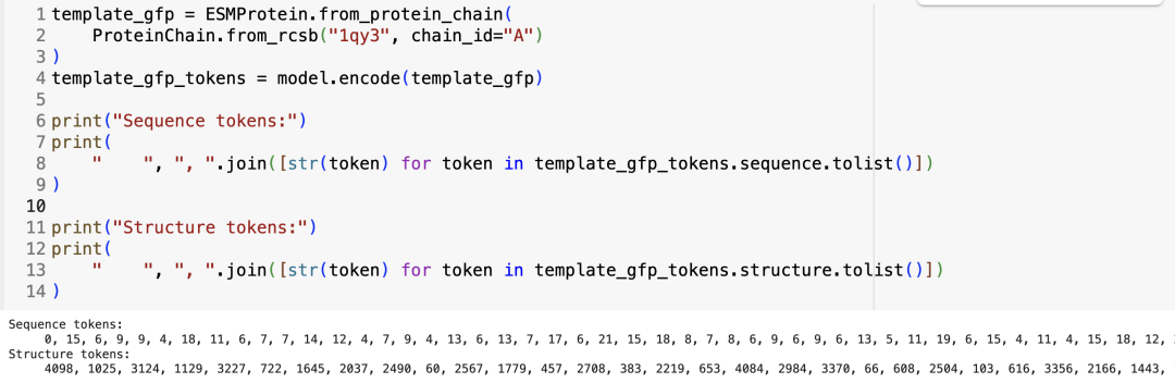 )这段代码的作用是:从pdb数据中加载一个GFP蛋白质结构(pdb id:1qy3,链:A),并且用esm3模型的编码器将其转化为序列和结构的token表示,用于后续提示词的构建。