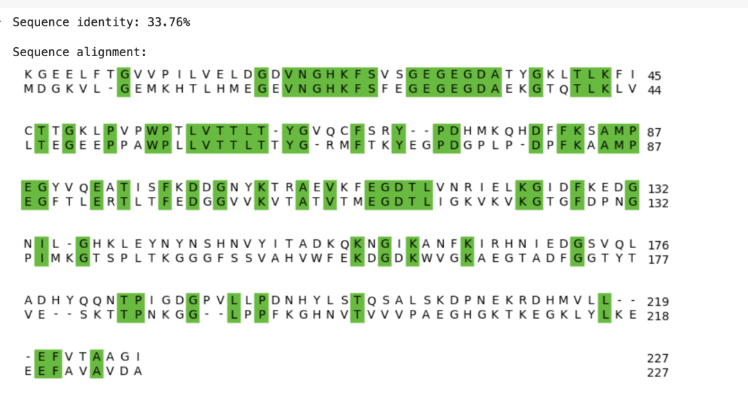 我们可以将这个序列与原始模板进行比对,看看它与avGFP有多相似。同时,也可以将其与所有已知的荧光蛋白进行比对,以评估这个潜在GFP的新颖性。