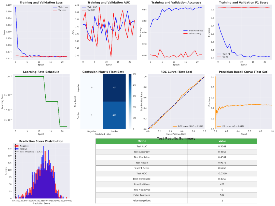 print(f"Val - Loss: {val_results['loss']:.4f}, AUC: {val_results['auc']:.4f}, Acc: {val_results['accuracy']:.4f}, F1: {val_results['f1']:.4f}")