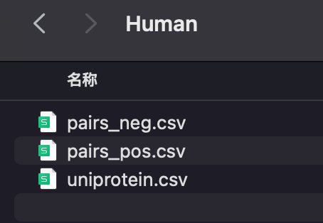 其中pairs_neg.csv 和pairs_pos.csv 格式一样,分别存放了阳性数据和阴性数据,其中的序列来自于uniprotein.csv,