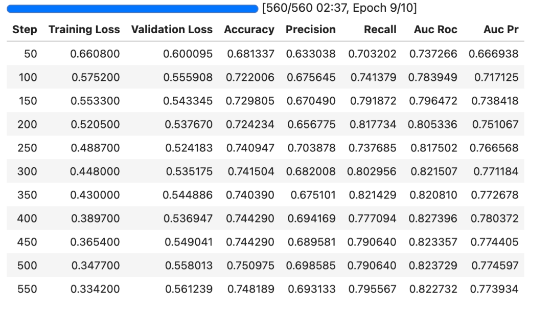 在训练的时候采用了早停机制,本次训练在双T4的GPU上运行,如果读者想要训练更好的模型,可以修改参数,进一步提高模型的性能。