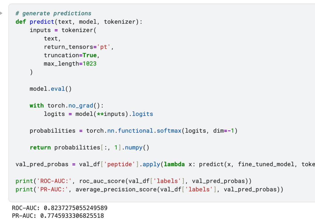 我们先把包含肽段序列和正/负标签的数据读入并分成训练集与验证集;再用 ESM 的分词器把序列转成模型能理解的“数字语言”;接着在预训练好的 ESM 上挂一个小小的分类头,用 LoRA 这种“只微调少量新参数、不改动大模型主体”的方式完成训练;训练过程中同步监控常见评估指标并启用早停,自动选出表现最好的版本。最终,我们得到一个基于蛋白质语言模型的免疫原性预测模型。