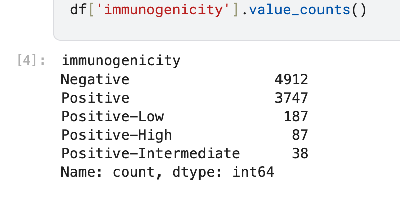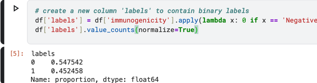 df['labels'] = df['immunogenicity'].apply(lambda x: 0 if x == 'Negative' else 1)