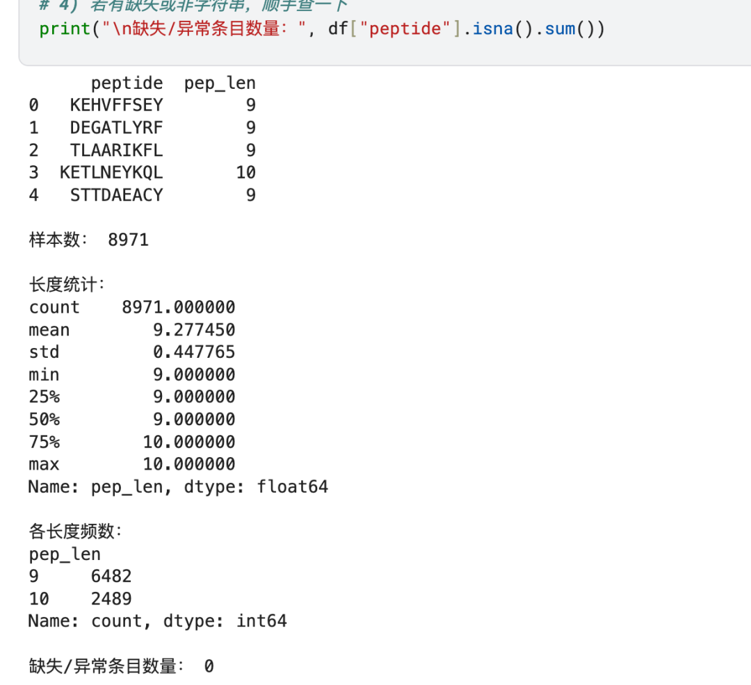 print("\n缺失/异常条目数量:", df["peptide"].isna().sum())输出: