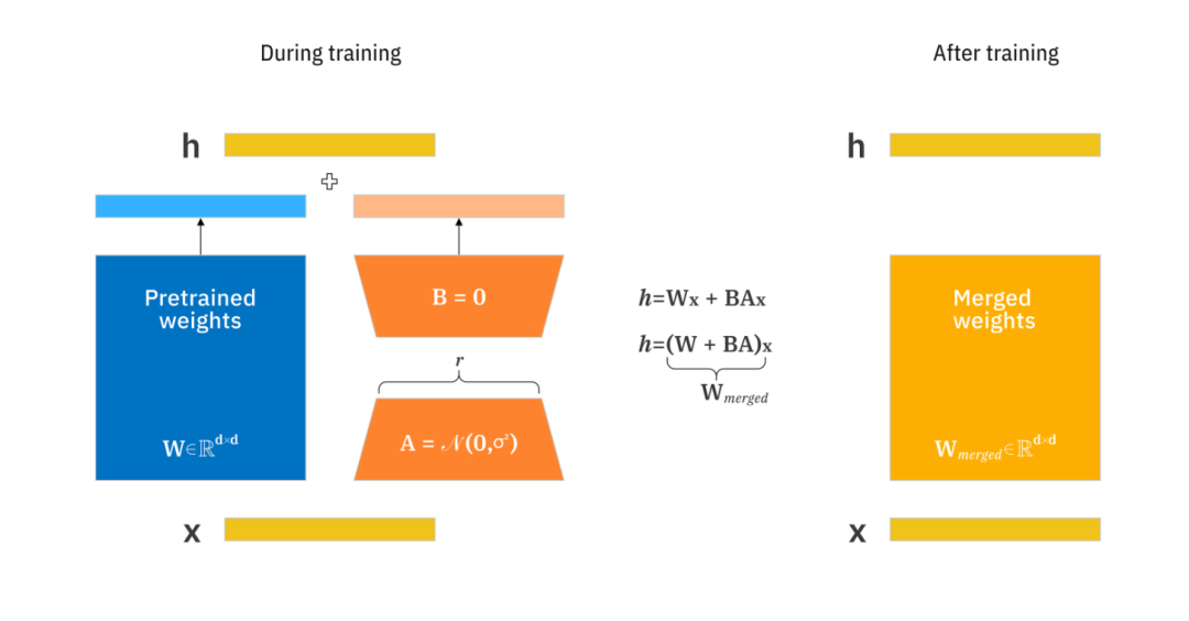 该图显示了 LoRA 如何通过使用秩为 r 的较小矩阵来更新矩阵 A 和 B,以跟踪预训练权重的变化。LoRA 训练完成后,较小的权重会被合并到一个新的权重矩阵中,而无需修改预训练模型的原始权重。