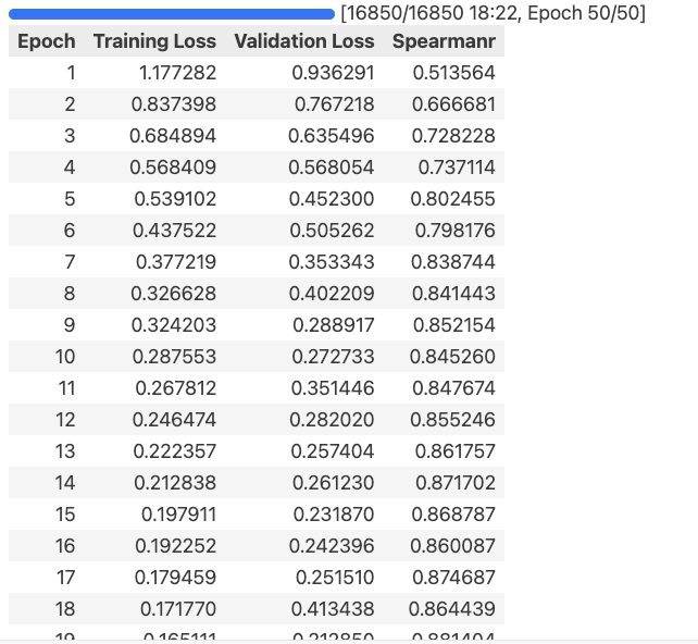 tokenizer, model, history = train_per_protein(checkpoint, my_train, my_valid, num_labels = 1, batch = 8, accum = 1, epochs = 50, seed = 42, mixed = True)