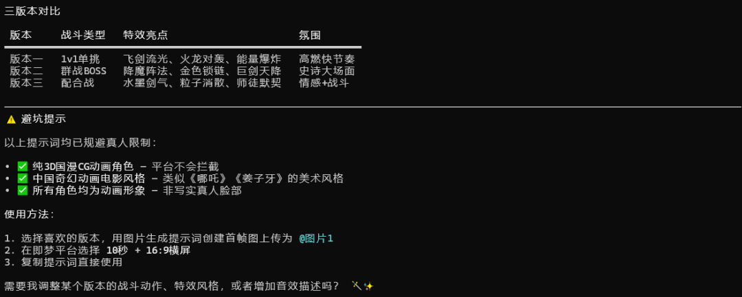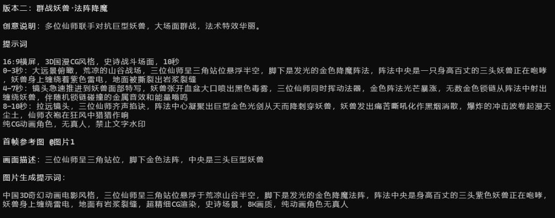 第三步:生成提示词 → ≤15 秒生成 2–3 个版本 → >15 秒自动拆分为多段拼接结构方案
