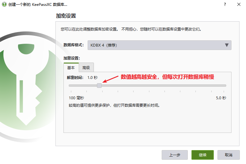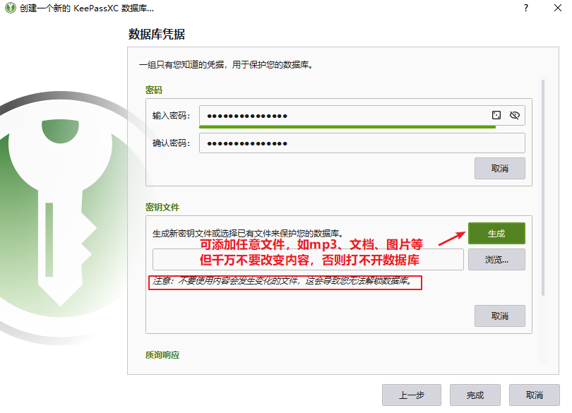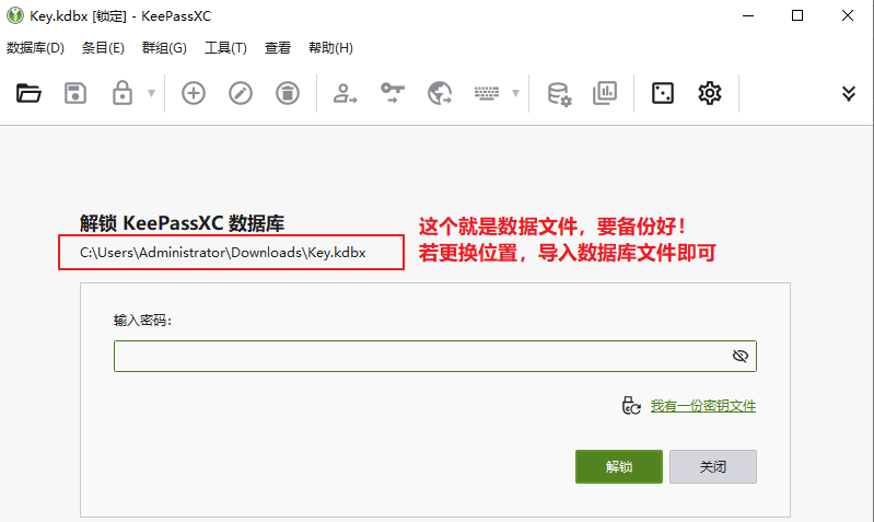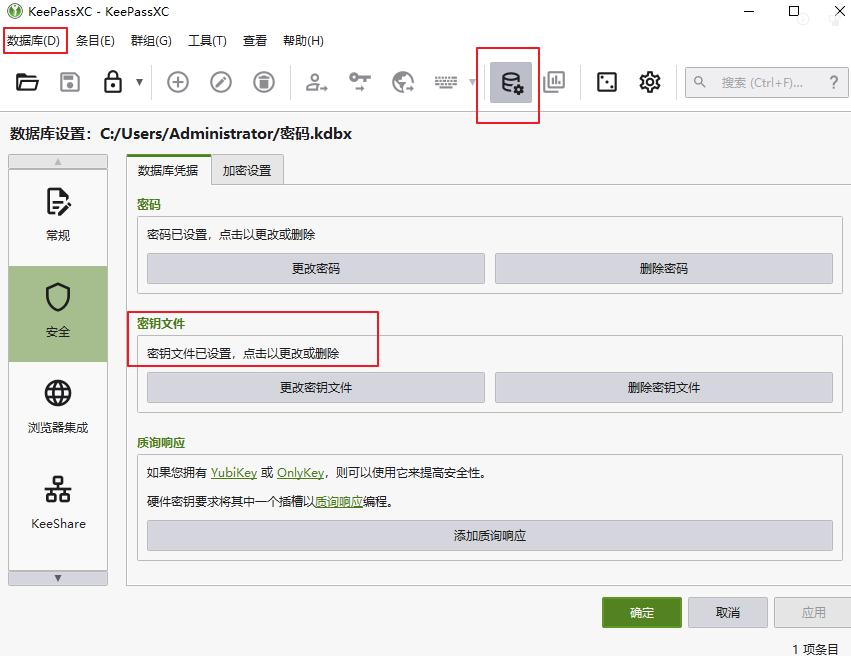 启用后,即使主密码泄露,没有密钥文件也打不开数据库。