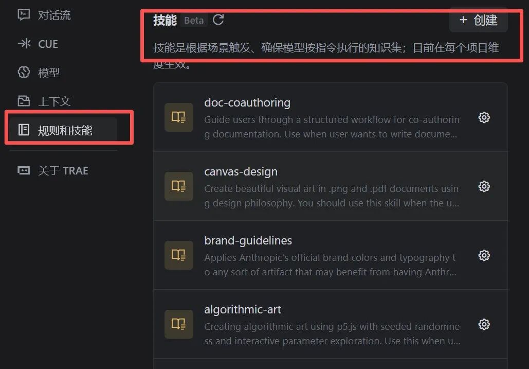 Trae | 元技能(核心) | Skill-creator(私有化) | Anthropics 官方元 Skill,支持创建 / 更新自定义 Skill,扩展 AI 能力 | 将 GitHub 开源项目转化为专属私有 Skill | 1. Trae 切换至 SOLO 模式;2. 进入「规则与技能」-「创建」;3. 上传 Anthropics 官方 SKILL.md 文件智能解析;4. 配置名称 / 描述 / 指令完成创建 |