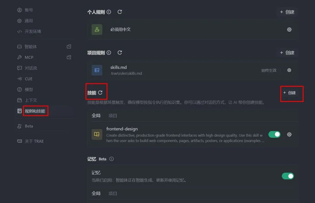 mkdir -p .trae/skills/技能名称(比如“greeting-zh”);SKILL.md文件,写入以下内容: