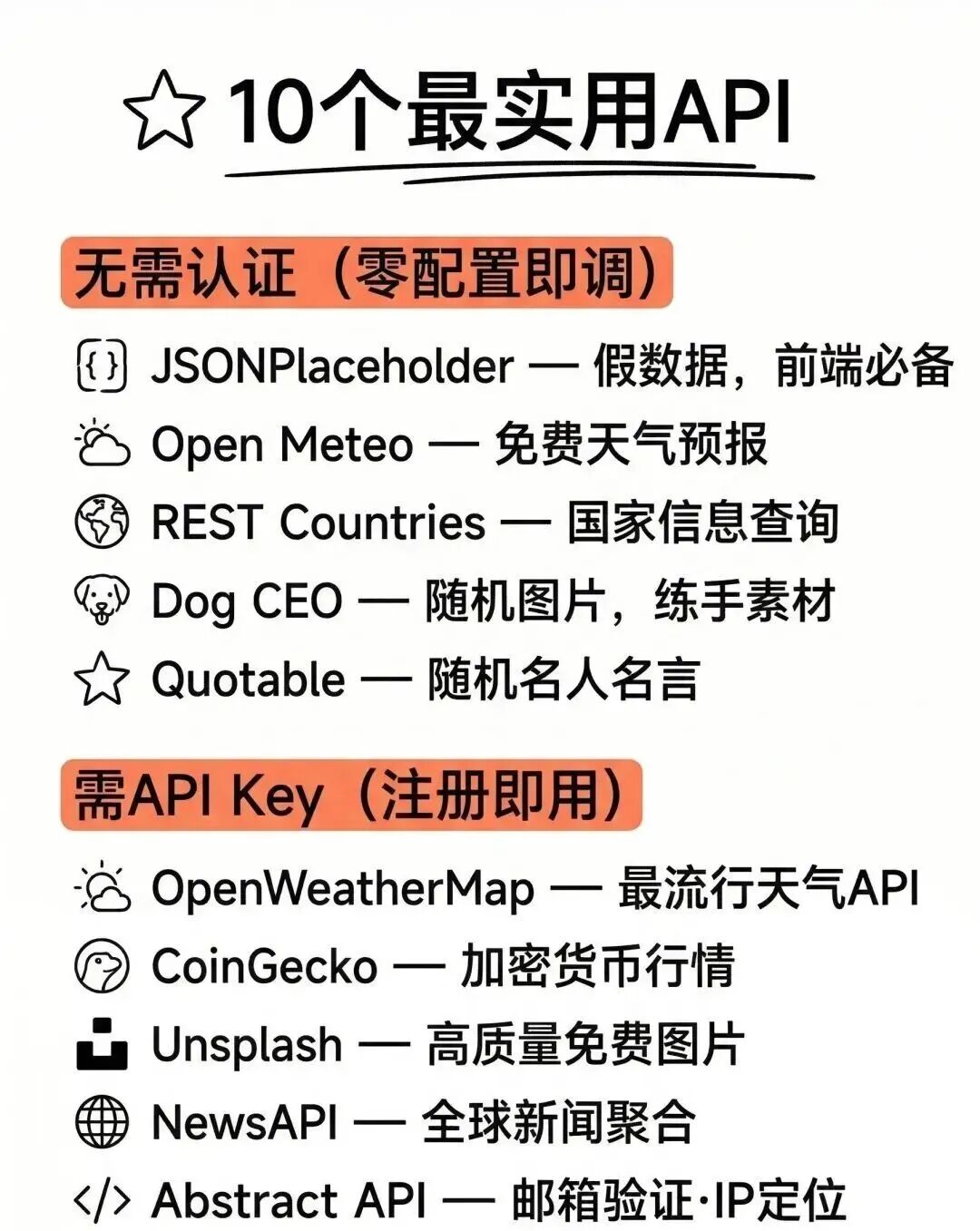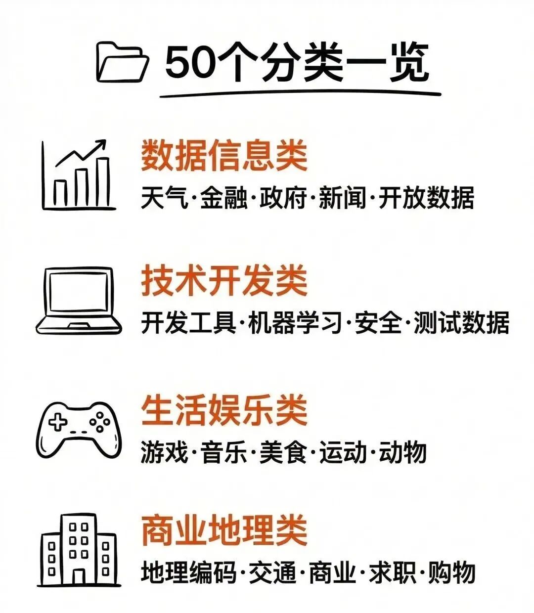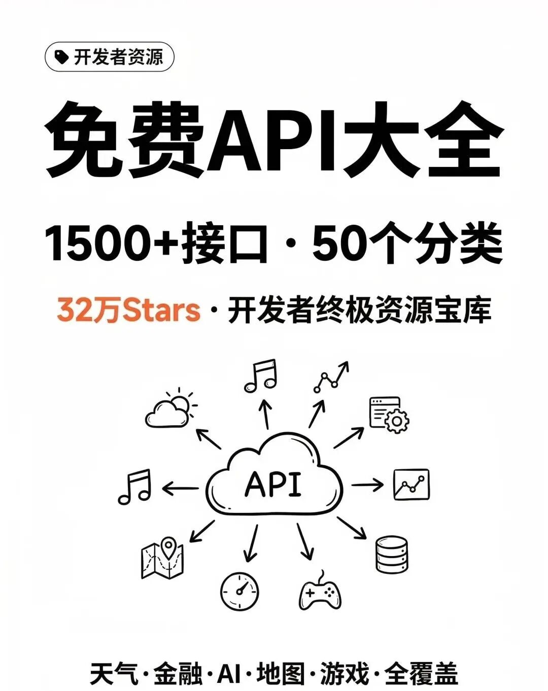 挑开发高频使用的50大分类,整理核心接口和适用场景,覆盖生活娱乐、技术开发、数据信息,按需自取即可: