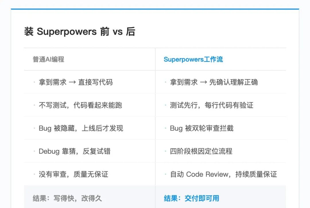 ECC以“全”和“深”为核心,凭借多语言支持、全场景Skill、完善的安全与记忆机制,成为多技术栈开发、企业团队协作的优选工具,能大幅提升开发全链路的效率与质量;Superpowers则以“精”和“简”为特色,通过强制工程化开发流程,让AI编程告别“随意写代码”的问题,适配编程新手与注重开发规范的轻量项目。
