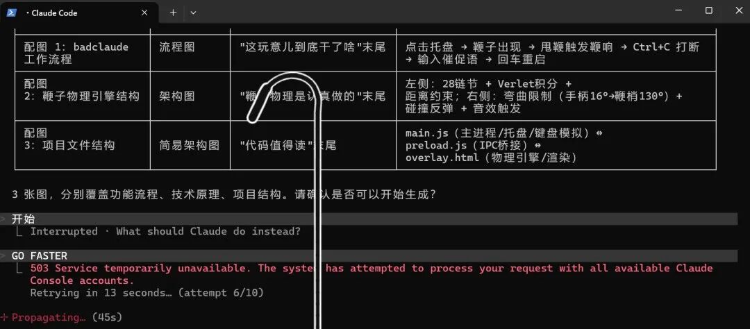 BadClaude是跨平台趣味辅助工具,基于Electron开发,通过模拟按键与物理动画,实现对Claude Code的打断重启,搭配鞭绳物理效果与音效,主打解压与任务重启。