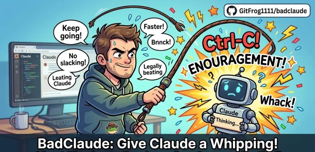 AI编程工具思考过慢、输出卡顿,容易引发等待焦虑。BadClaude以趣味交互方式,通过虚拟鞭子打断慢响应进程,搭配音效与动画实现情绪释放,同时触发任务重启,改善等待体验。工具兼顾趣味性与实用性,可缓解操作焦虑,让终端交互更具乐趣。