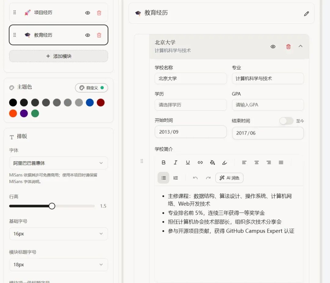 填写基础经历信息后,可在设置中配置DeepSeek、豆包、OpenAI、Gemini等主流大模型的API Key,一键完成内容润色、语法纠错、成果量化优化,让经历描述更贴合岗位需求。