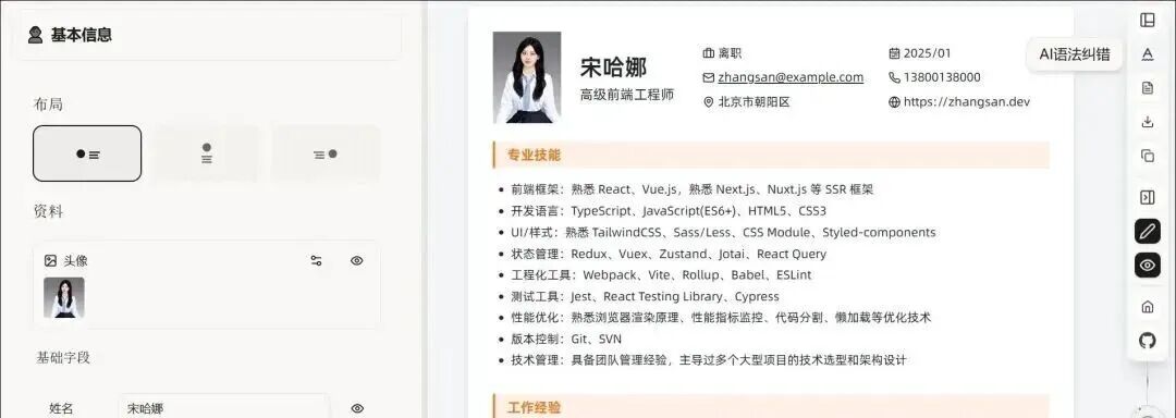 免注册登录、数据全程本地存储,覆盖多模板排版、AI内容润色、格式智能适配、多格式一键导出全流程,可在线即用也可本地/Docker私有化部署,解决简历制作中格式混乱、付费套路、隐私泄露、内容表达不专业等核心痛点,适配应届生、职场跳槽等各类求职场景。