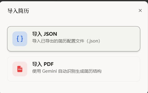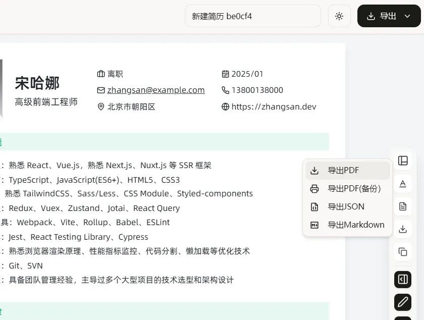 编辑完成后,可一键导出适配打印投递的PDF文件,也可导出JSON/Markdown格式文件备份,后续可跨设备导入恢复编辑,数据完全自主可控。