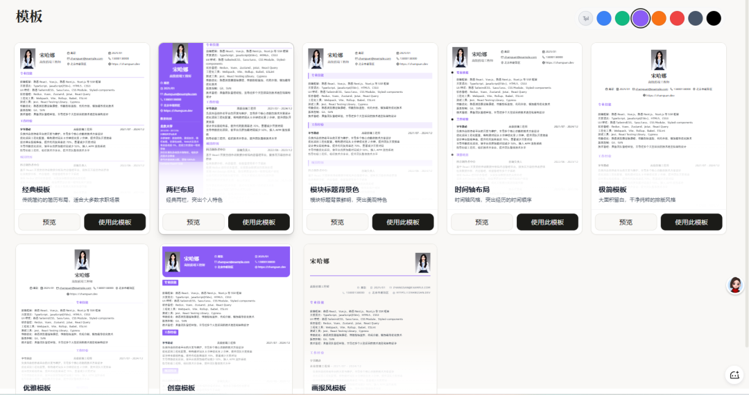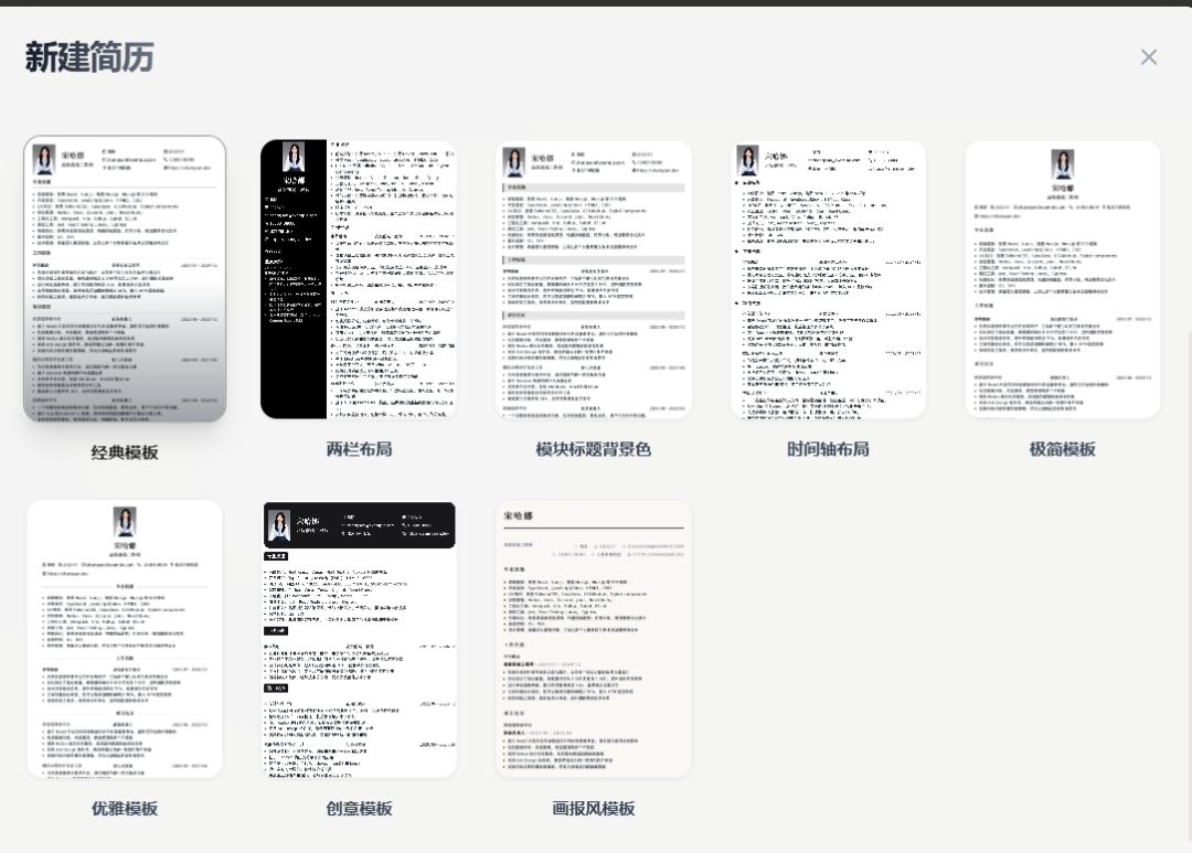 内置经典、两栏、时间轴、极简、创意、画报风等多套模板,适配技术、运营、设计、市场等不同岗位的求职需求,可一键切换预览效果。