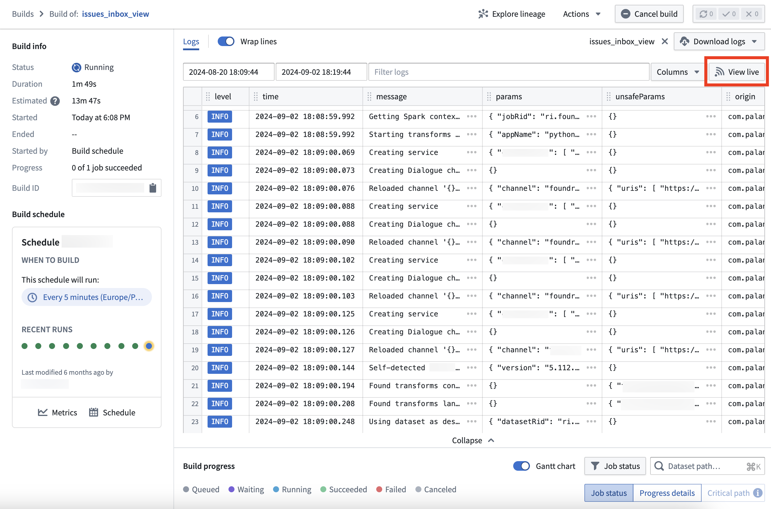 Progress | 作业执行 | 构建的任务完成进度,0 of 1 job succeeded表示1个作业,0个成功完成 |