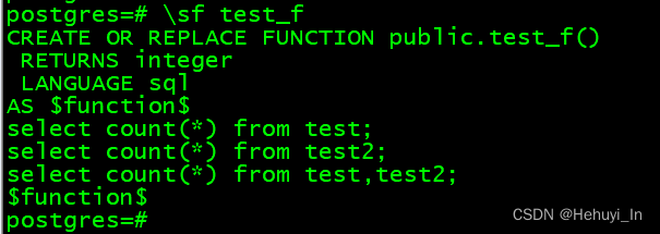 psql -c "\sf test_f" > test_f.sqlbash注意raise要用plpgsql语言,像上面用sql会报错,为方便测试稍微做点改造。