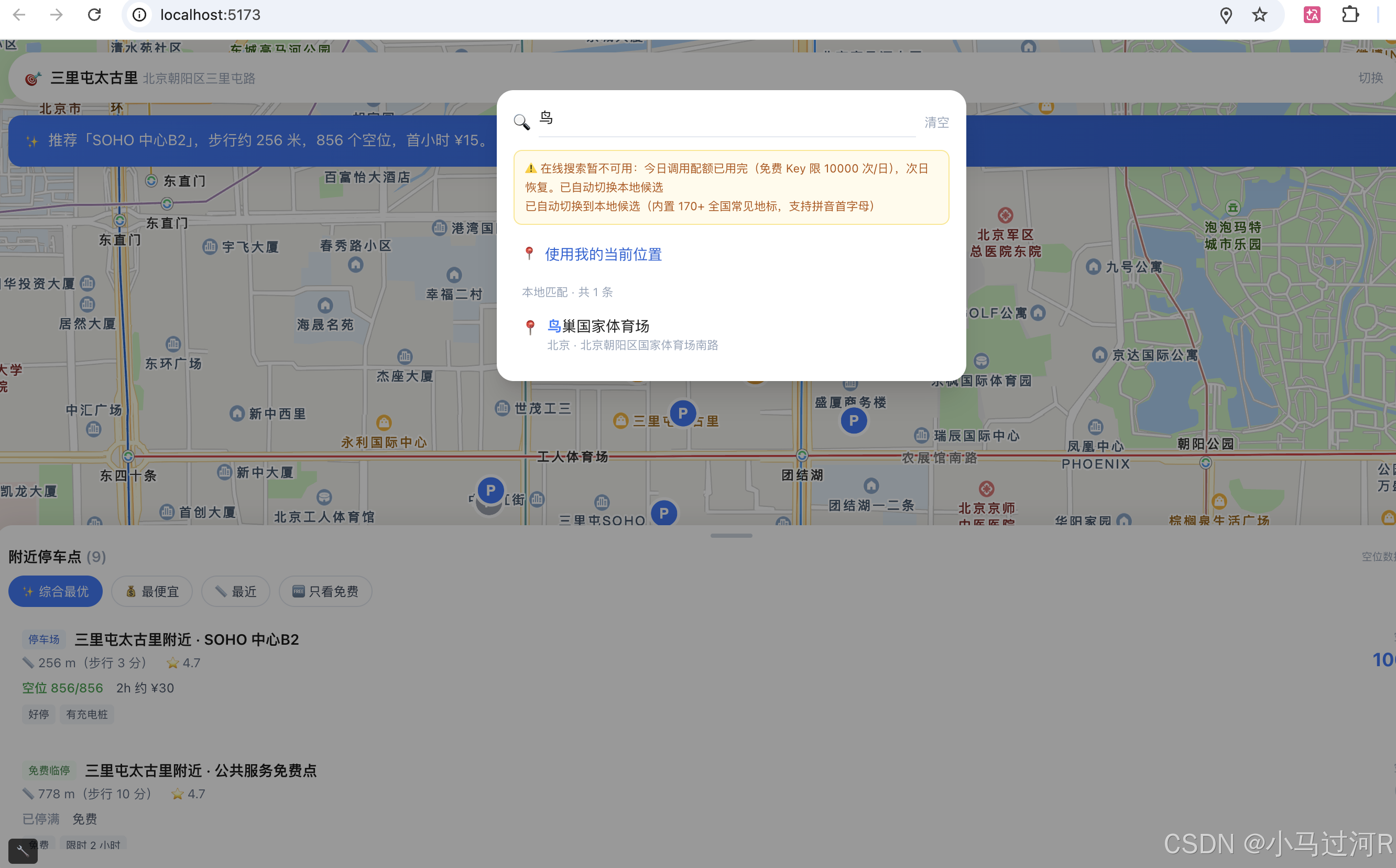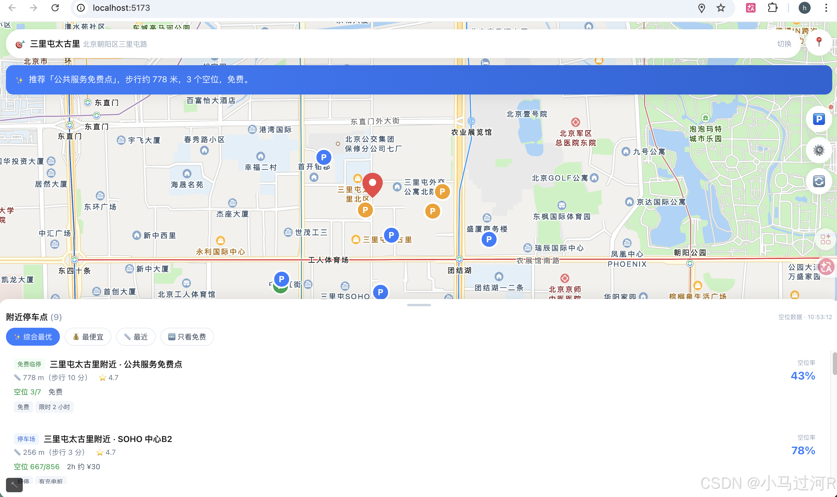 - [ ] 用户输入任意城市地址,能在地图上看到 ≥ 5 个周边停车点