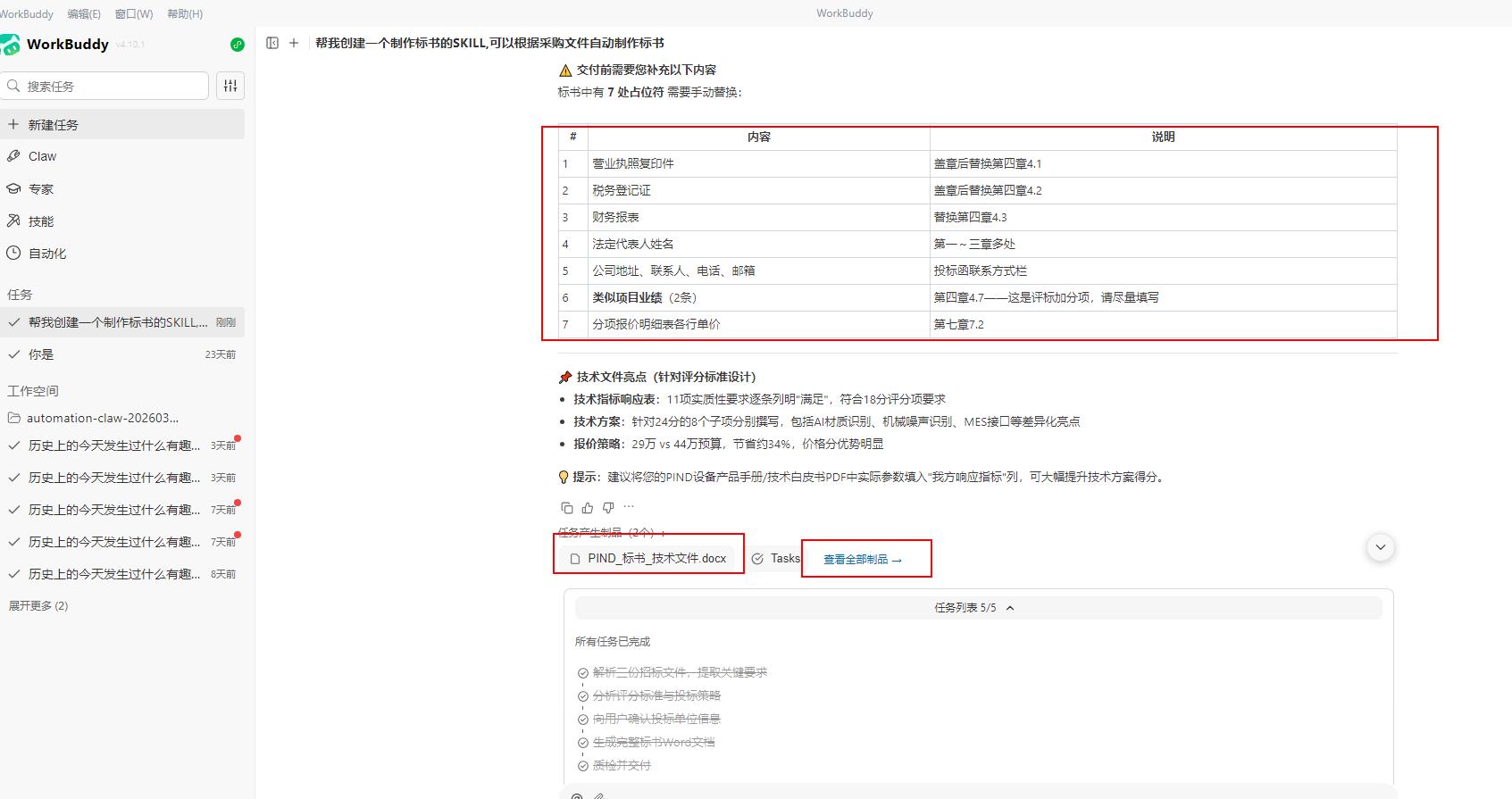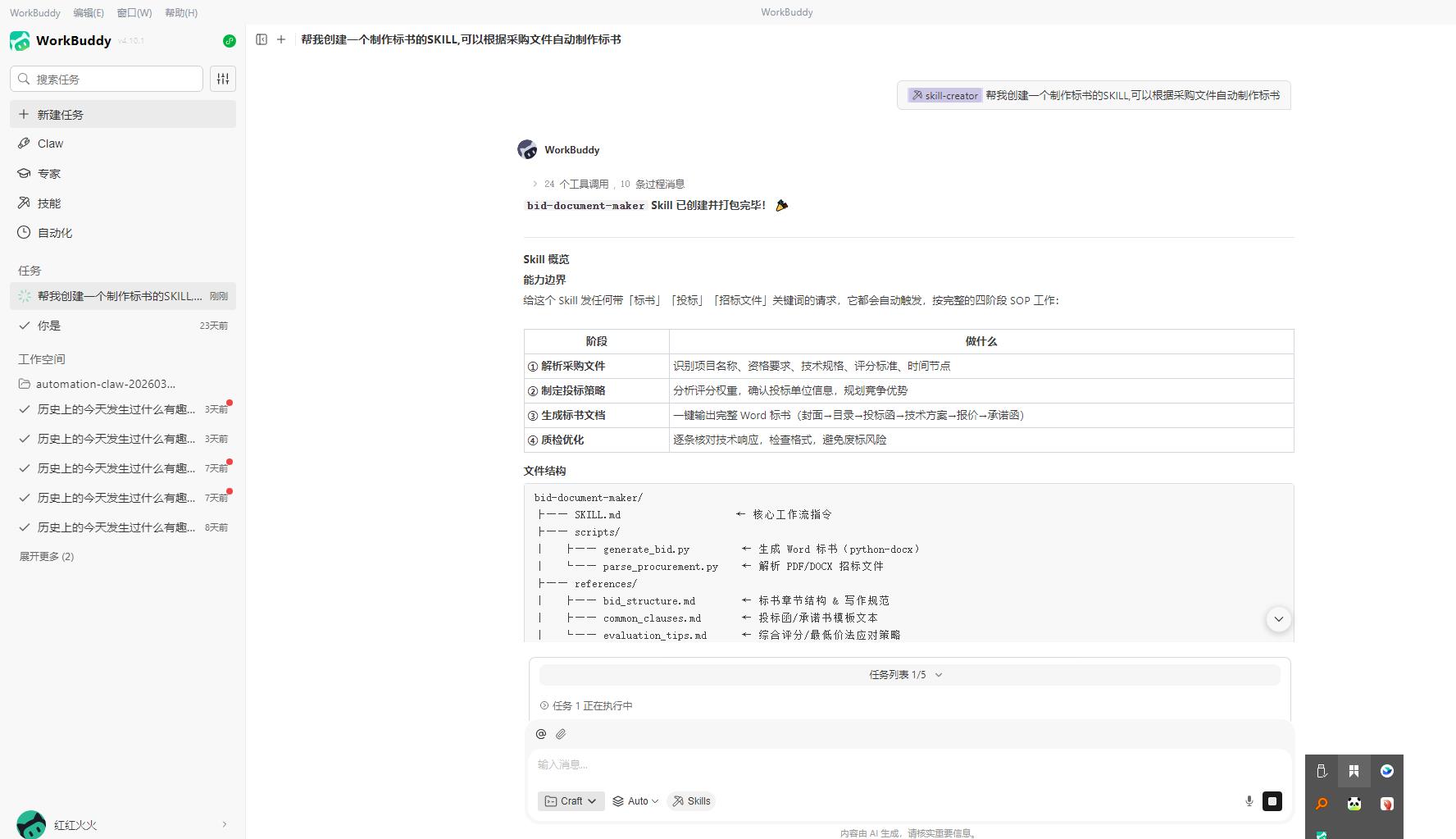 原因是,我用WorkBuddy创建技能的功能,给自己造了一个「做标书」的AI Skill——我把做标书的全流程,教会了AI自己。