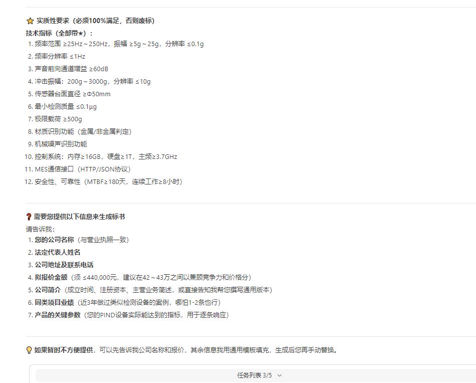 比如,同样是「声音前向通道增益≥60dB」,AI自动补充了:「我方采用低噪声前置放大器设计,增益可达65dB(典型值),信噪比满足精密检测需求。」——比原要求多出5dB的余量,让评委没有理由扣分。如下图5: