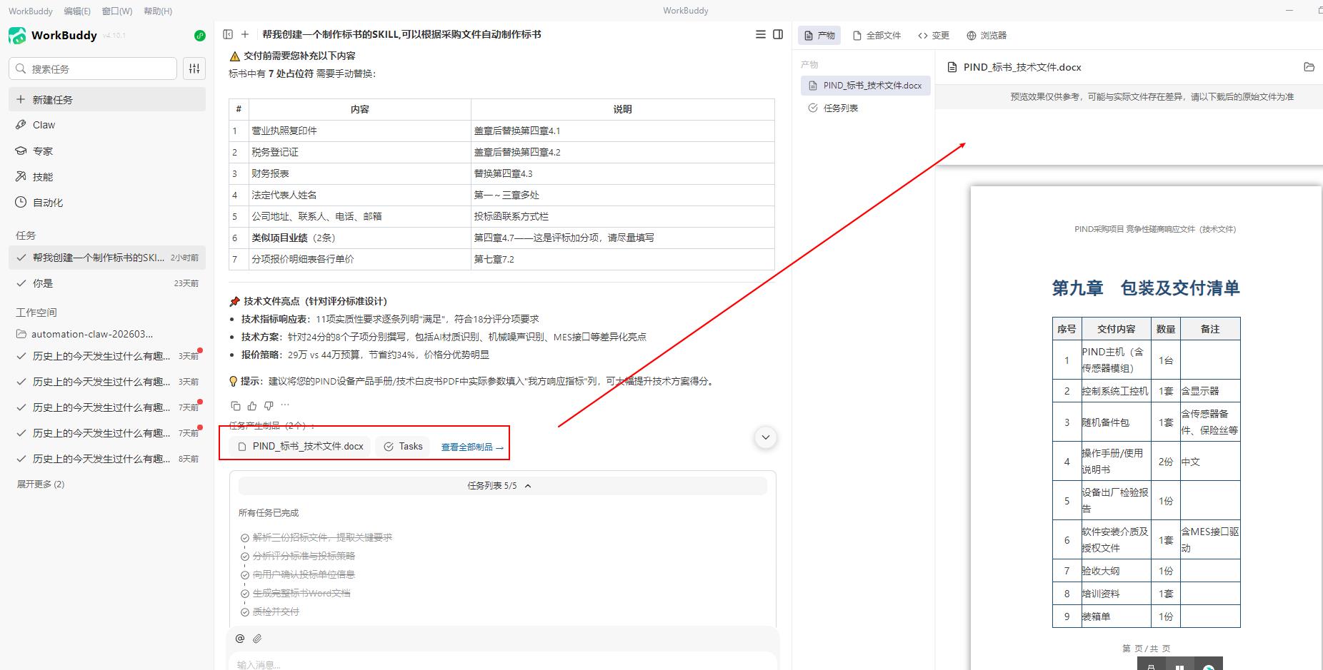 🎯 整个过程:我只说了几句话,AI自动解析了3份文件、识别了11项技术要求、匹配了24分的评分策略,最后生成了一份9章完整结构的专业标书Word文档。