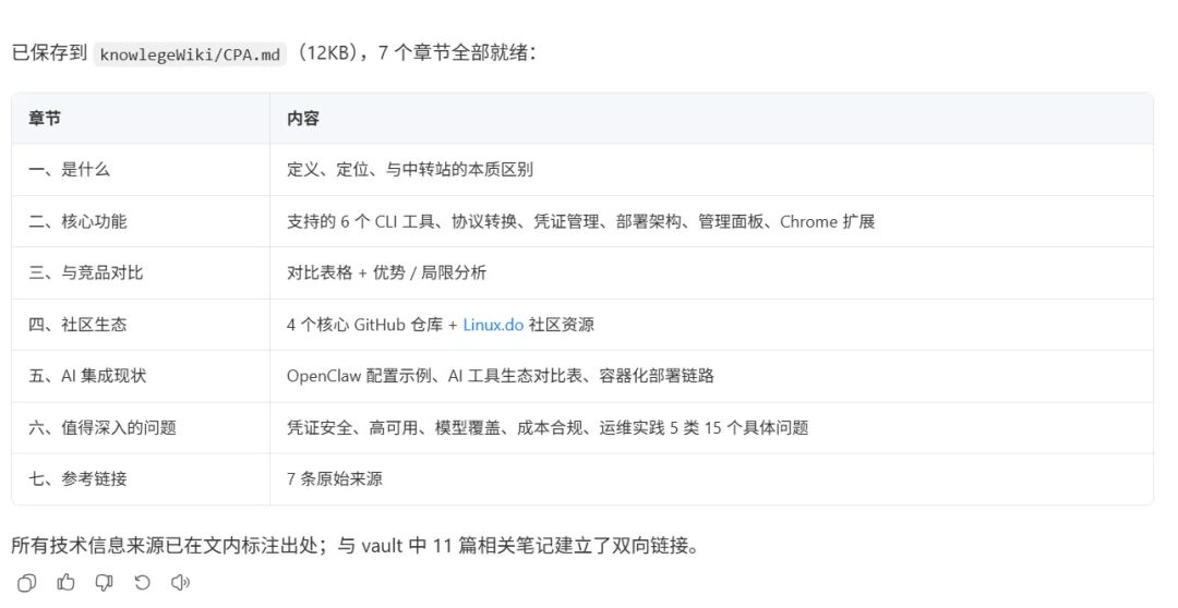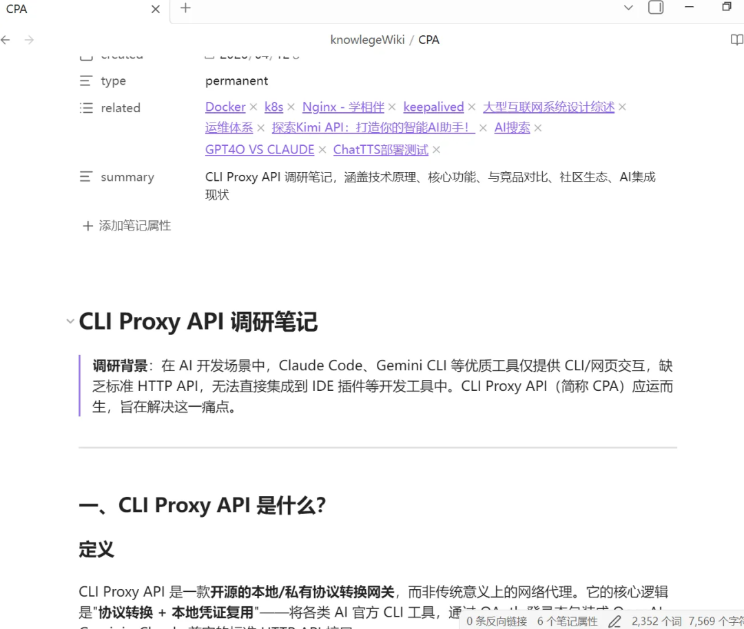 读取 raw/ ⽬录下所有关于CLI PROXY API的调研⽂件。 帮我整合成⼀篇wiki⽂章,保存到 knowledge/CPA.md。 要求: 1. 按主题组织(是什么、核⼼功能、和竞品的对⽐、社区⽣态、AI集成现状) 2. 标注每条信息的来源 3. ⽤[[双向链接]]链接到vault中已有的相关笔记 4. 列出调研中发现的、值得深⼊了解的问题