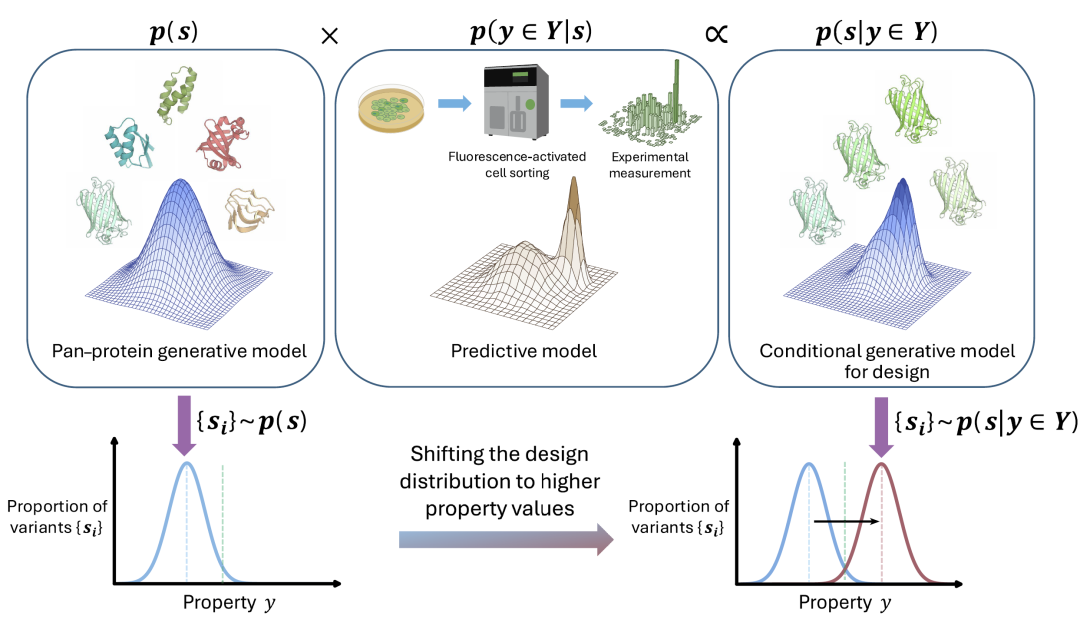 该图展示了蛋白设计可以被理解为从条件概率分布中采样序列的过程。研究人员通过将预训练的生成模型与实验数据构建的预测模型结合,使生成分布向高性能区域偏移,从而实现定向设计。