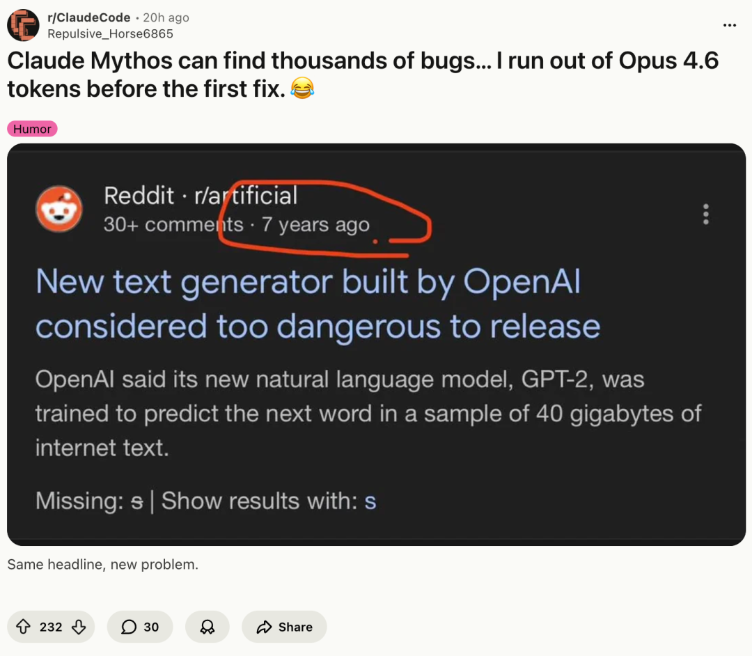 Claude Mythos 能找几千个 bug,我的 Opus 4.6 token 还没撑到修完第一个就用光了 😂