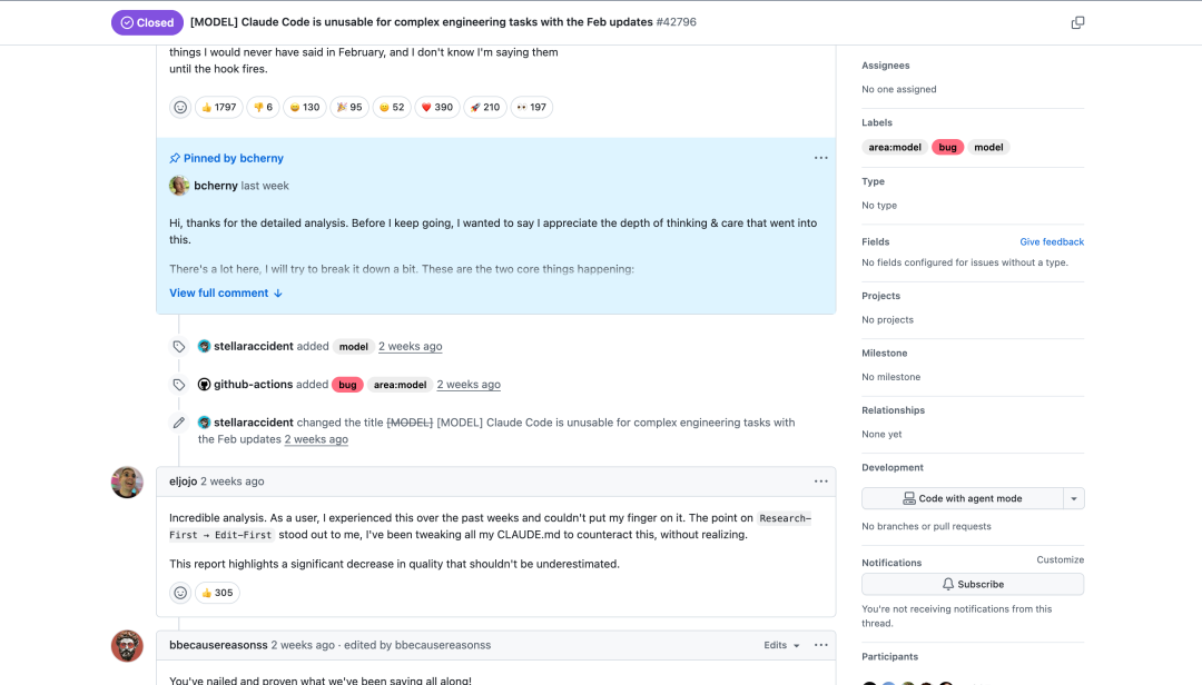 GitHub 上 anthropics/claude-code 仓库的 #42796 号 issue,发帖人叫 Stella Laurenzo,IREE 和 MLIR 编译器项目的核心开发者,一个在 Google 干重活的人,天天用 Claude Code 写生产代码那种。