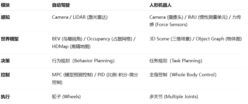 从工程架构来看,我们可将所有具身智能系统抽象为五个核心模块:感知(Perception)、世界模型(World Model)、决策(Policy/Planning)、控制(Control)、执行器(Actuator)。自动驾驶与人形机器人的模块技术对比,清晰揭示了二者的同源性与差异点:
